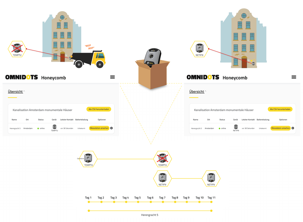 Am Beispiel eines Kanalisationsprojekts an den Grachtenhäusern in Amsterdam erklärt Lourens Rozema (CTO von Omnidots) den Vorteil der Auswertung von Messpunkten anstelle des Messgeräts selbst. „Für ein groß angelegtes Kanalisationsprojekt an den Amsterdamer Grachten mussten Erschütterungsmessungen durchgeführt werden, um die großen monumentalen Stadthäuser Amsterdams zu schützen. Der Austausch der Kanalisation geschieht nicht auf einmal, sondern Stück für Stück. Die Erschütterungsmessungen werden an den Häusern durchgeführt, wo der Bagger gerade arbeitet. Dies ermöglicht Ihnen, die Sensoren zu bewegen und für jedes Haus in der Messplattform einen neuen Messpunkt anzulegen. Sie haben also für jedes Grachtenhaus einen Messpunkt in der Online-Plattform Honeycomb geschaffen, benötigen jedoch möglicherweise nur drei physische Messsensoren.“